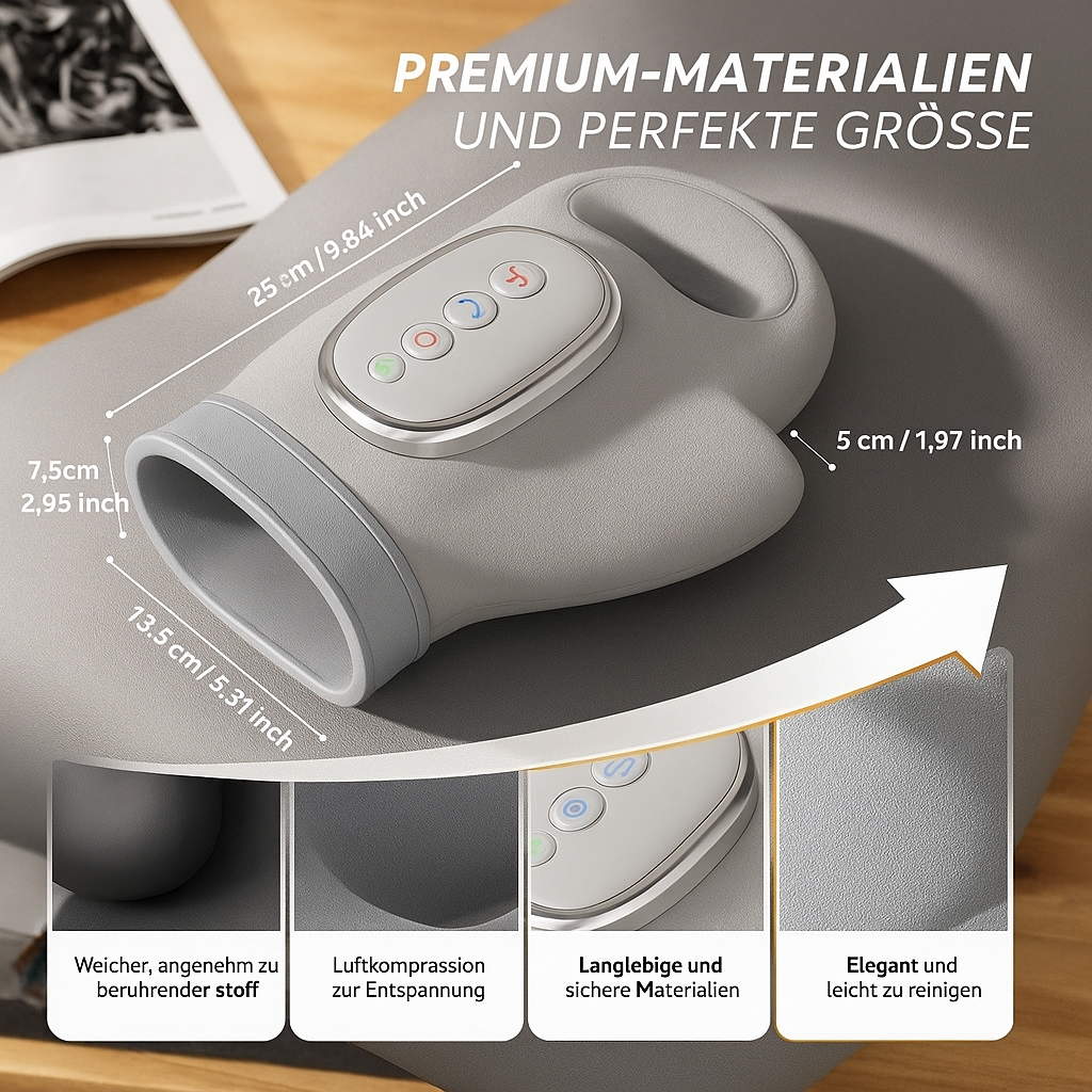 Mit 3 Massage-, 5 Kompressions- und 4 Wärmestufen passt sich der Handova™ perfekt deinen Bedürfnissen an – bei Steifheit, Schmerzen oder müden Händen.