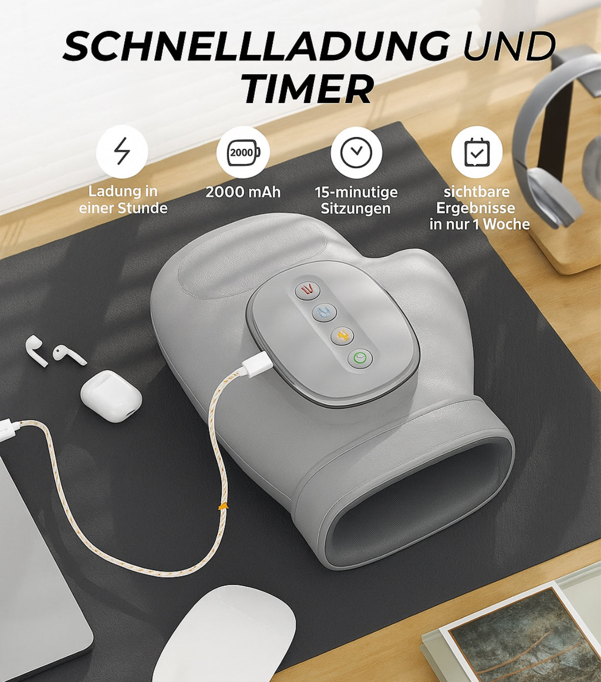 Mit Schnellladung und langlebigem Akku bietet Handova™ automatische 15-Minuten-Sitzungen – für tägliche, mühelose Linderung.